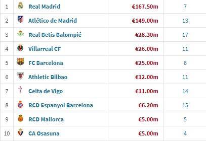 皇马、马竞之后,排名第三的贝蒂斯目前只花费了2830万欧,第四的比利亚雷亚尔花费2600万欧。巴萨2500万欧暂排第五,引进了胡安-加西亚和拉什福德。